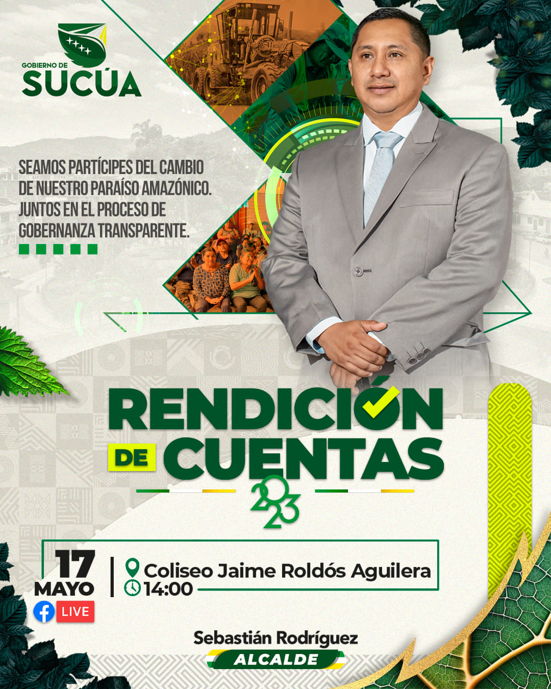 Conforme lo establece la Ley Orgánica de Participación Ciudadana, la Ordenanza que Conforma y Regula el Funcionamiento del Sistema de Participación Ciudadana y Control Social, el Gobierno Municipal del cantón Sucúa, tiene el honor de invitar a la ciudadanía en general a la «Rendición de Cuentas del Año Fiscal 2023», por parte del señor alcalde, los señores concejales y las entidades adscritas al Gobierno de Sucúa.